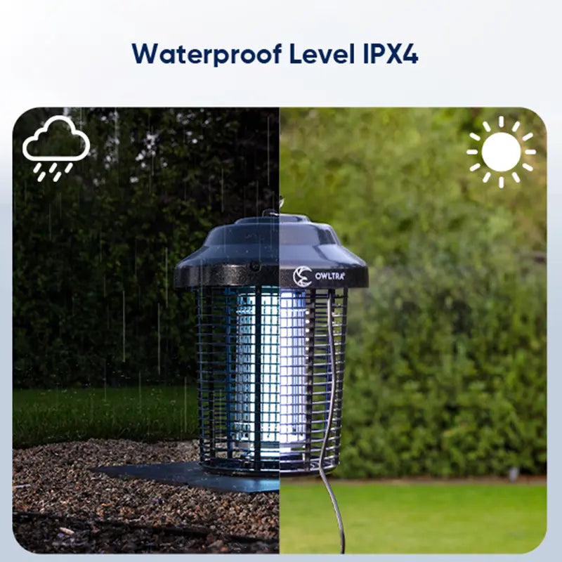 OWLTRA electronic insect killer has a waterproof level IPX4 and can be used in all-weather conditions - rain or shine. It has a high-efficiency, non-clogging killing grid, and a rugged, weatherproof polycarbonate construction. It will not rust, crack, or fade.