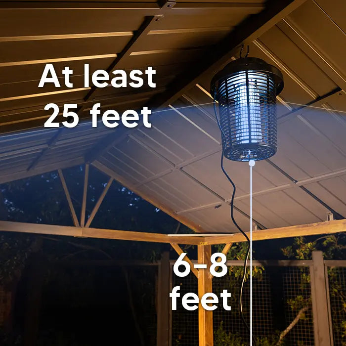 Hang the insect killer at a height of six to eight feet above the ground. Place the unit 25 feet away from the area intended for human activity.