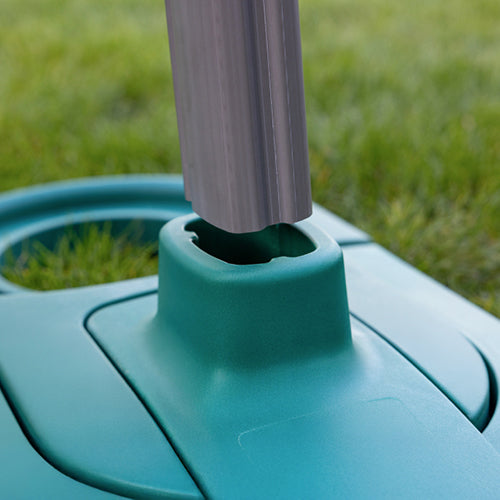 Adjust the base for the size of our propane tank, secure it with three screws, then insert and align the support pole into the base.