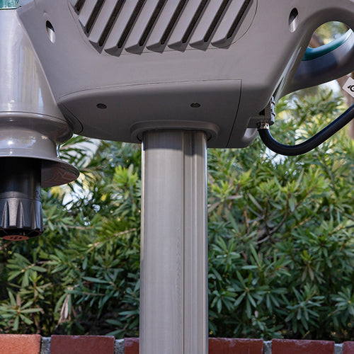 Firmly hold the power head and place it onto the support pole, aligning it properly and inserting it into place.
