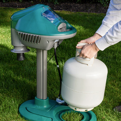 OWLTRA Super Effective Mosquito Trap uses propane to simulate human breathing, releasing CO2, and incorporates a heating unit to mimic human body heat. This attracts mosquitoes, no-see-ums, black flies, midges, and other biting insects. The patented counterflow technology guarantees even CO2 distribution and prevents bugs from escaping. Once captured, they are trapped in a bug box, and dehydrate and die within 24 hours.